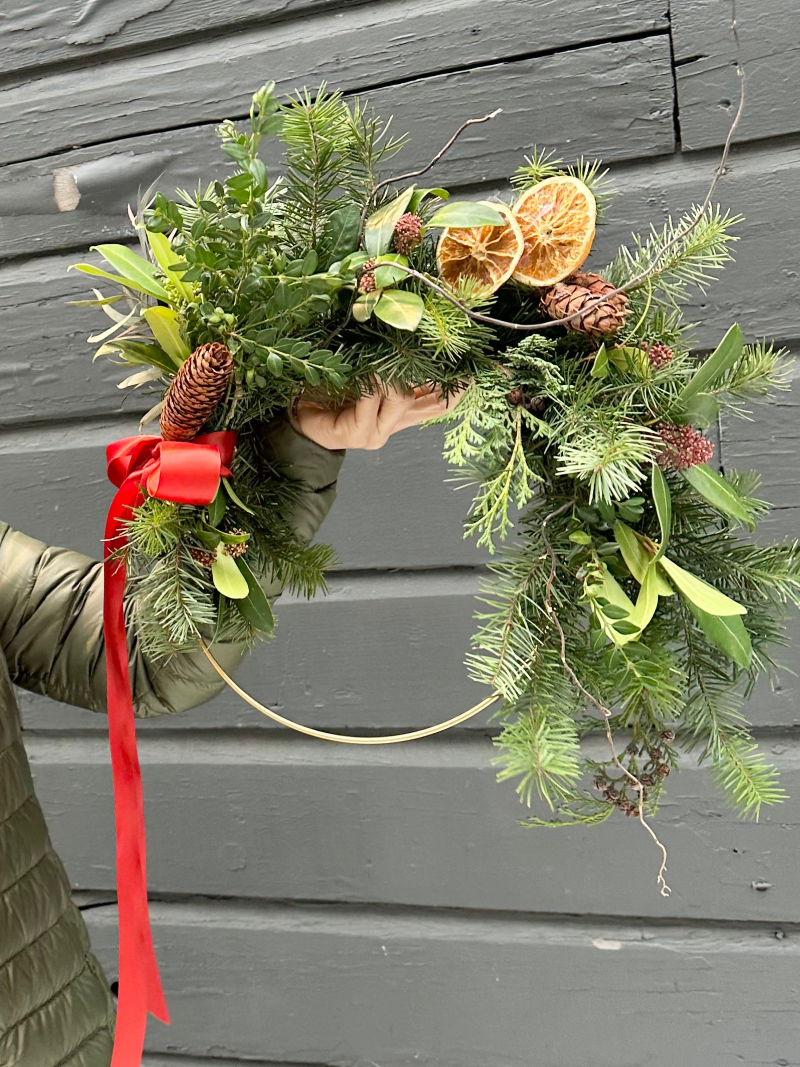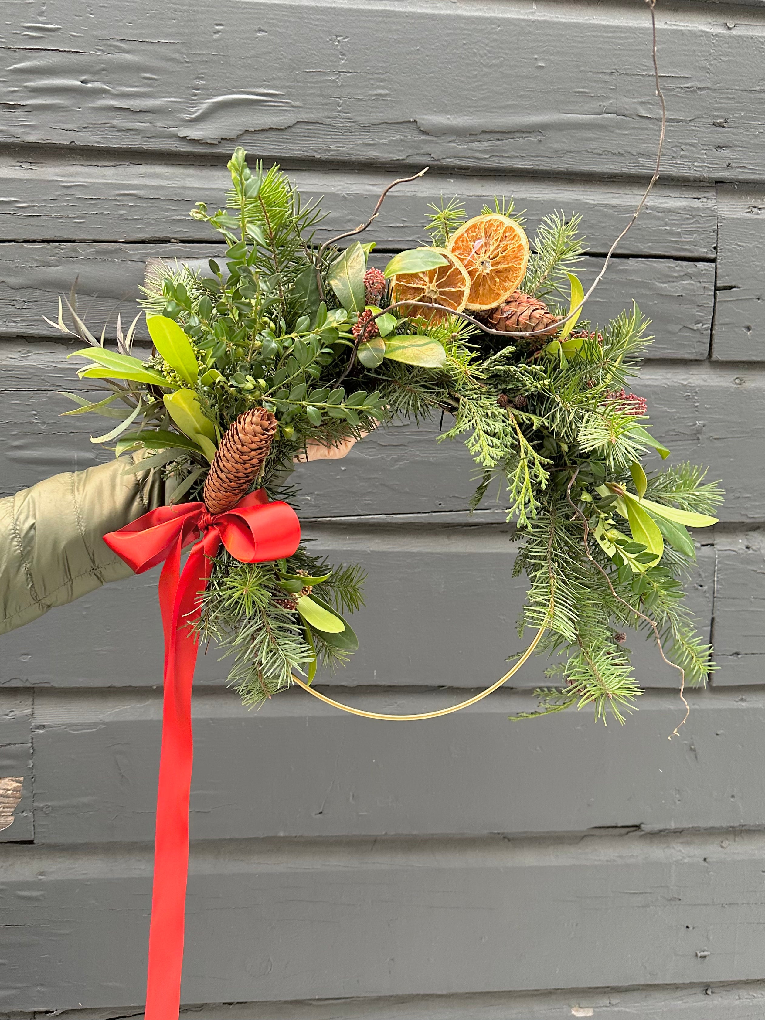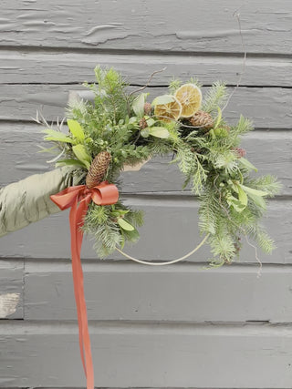 Our Half Moon Gold Hoop Holiday Wreath is a simple and charming design that brings just the right amount of festiveness and winter cheer. Fresh evergreens, pinecones, dried citrus, and a classic ribbon create a warm and seasonal look while keeping the style light and elegant.
